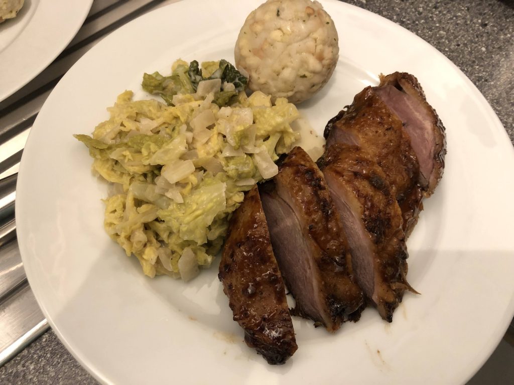 Die Gans aus dem Ofen nehmen, Ofen ausschalten und die Gänsebrust von dem Knochen ablösen (tranchieren – gibt es gute Youtube Videos, die das zeigen).